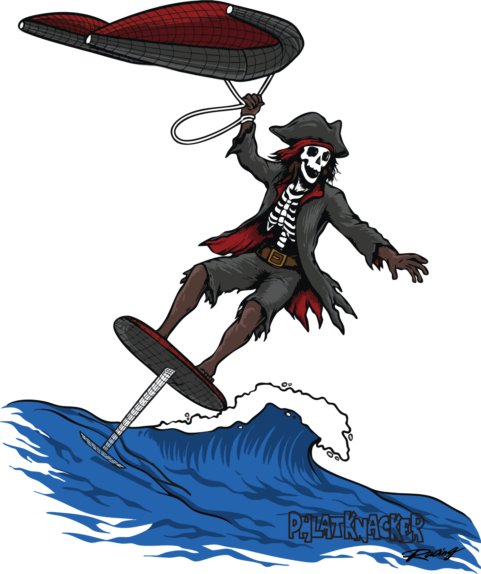 Phlatknacker Racing Series - Wing style foiling design with Cap'n Cocked Hat the Pirate. Printed on a quality cotton tee
